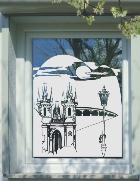 Eine künstlerische Darstellung der Skyline von Prag. Hier sehen wir im Vordergrund ein Teil der Burganlage des Hradschin. Im Hintergrund sehen wir die Karlsbrücke.