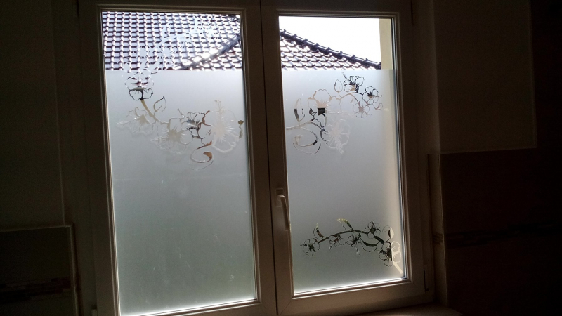 Dieses Bild ist ein Volltreffer! Es wird sehr gern bei uns bestellt. Hier vereinen sich wieder beide Techniken. Unten sehen wir das Negativbild als Sichtschutz. Oben sehen wir die zarte Blume, die dem Gesamtbild das gewisse Etwas verleiht. Diese Motive, egal wo sie dieses Bild positionieren, es verleiht den Raum einen Hauch von Exklusivität.