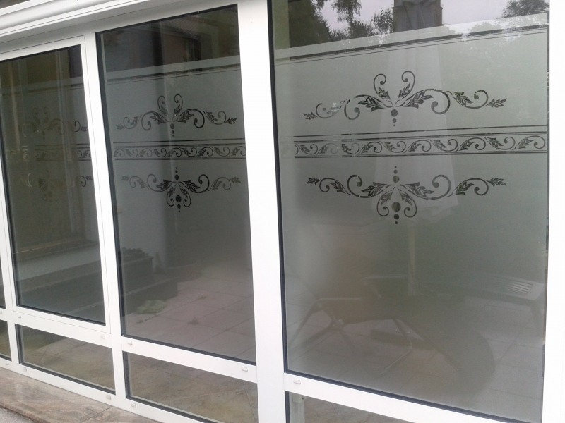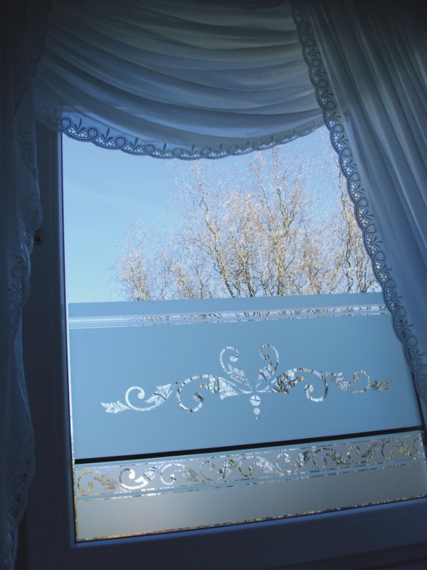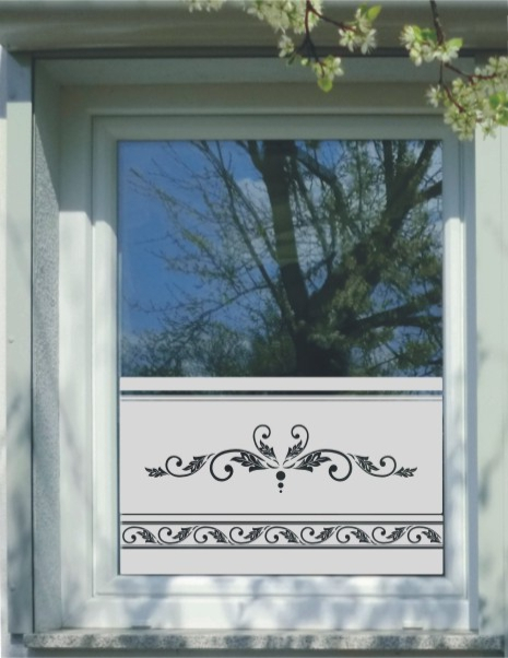 Das ist ein Bad Fenster. Da sich Elemente aus dem Bad im Fenster wiederspiegeln sollten, diente uns eine Fliesenbordüre als Vorlage. So können Bordüren , Fliesen, Tapetenmuster u.s.w. in Ihre Folie eingeschnitten werden. Das kann sich über Spiegel, Duschabtrennungen, Sichtschutzwände, sogar Fliesen, ziehen, so daß es ein einheitliches Konzept im ganzen Raum ergibt. Hierzu nehmen Sie Kontakt mit uns auf. Mit unserer über 30. jährigen Erfahrung stehen wir Ihnen mit Rat zur Seite.