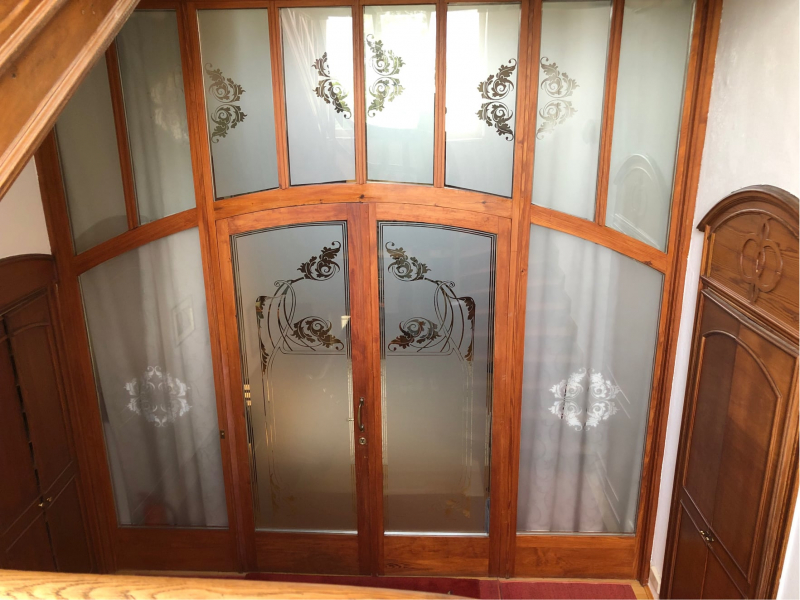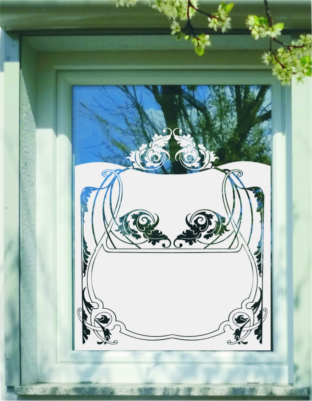 Die meisten unserer Folien Jugendstil, finden sie in der Kategorie Fensterfolien. Hier sehen sie ein Beispiel, einer bedeckten Teilfläche. Die Sichtschutzfolie könnten wir auch mit einen Schriftzug versehen.